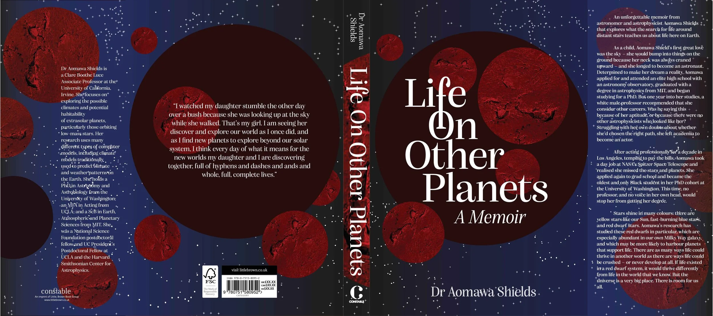 To design a cover for Dr Shields’ moving memoir about finding her place in the universe as a human and astrobiologist whilst researching about how life can be supported on other planets.